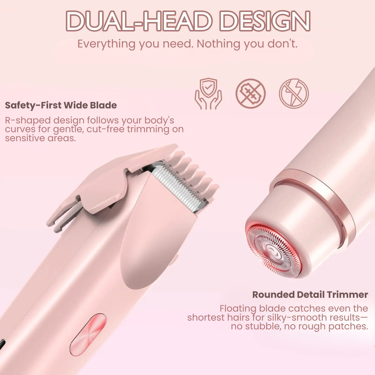 Hypoallergenic stainless steel with a rounded safety edge glides over curves without catching or cutting. No nicks, no razor burn, no morning-after regret.